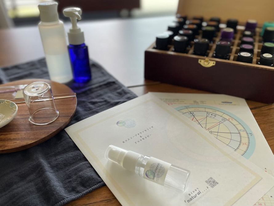 ご自身のホロスコープチャート(生まれた日の天体の配置図)から、太陽の星座に紐づく精油を使ってアロマスプレーを作ります。